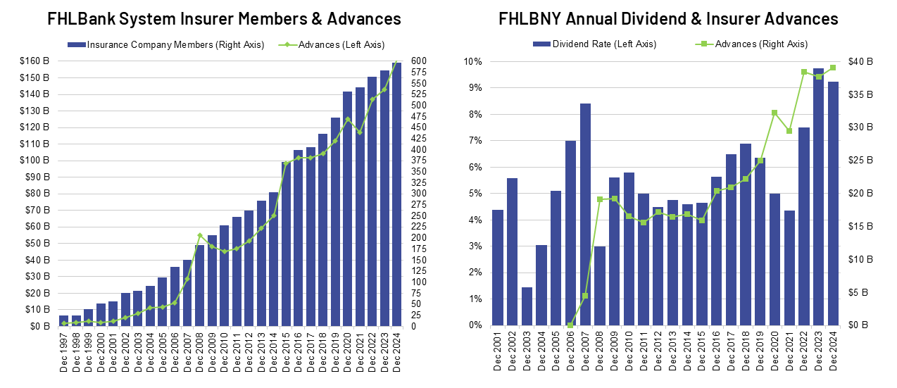Membership and advances by insurance companies have increased exponentially as more and more realize the integral role the FHLBNY plays to insurers looking to converge liquidity and working capital needs (as shown in the chart below). Overall, the Federal Home Loan Bank System (FHLBanks) has over 596 insurance company members, while the percentage of all FHLBanks borrowings by insurance companies has increased from $28.67 billion to $161.14 billion between 2007 and 2024.