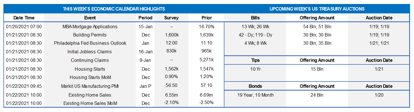 On the UST supply front, next week brings a 10-year TIPS and a nominal 20-year auction. And corporate issuance should accelerate further post its usual strong start-of-the-year pattern. Indeed, watch for a slate of bank issuance after the recent Q-4 2020 earnings releases. Attention will also remain on Covid-19 and fiscal legislation developments.