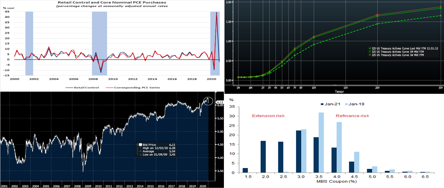 Source: Bloomberg. Week-over-week, the UST curve mildly “bull flattened”, as yields fell 2 to 5 bps in progressive fashion out the curve. The Fed’s guidance and programs continue to pin shorter-end yields, and so it was maturities 4-year and longer that led the move. Weaker economic data, a worsening Covid-19 situation, and Fed Chairman Powell’s comments that it is “too early” to talk of asset-purchase tapering all contributed to “take the wind out of the sails” of the recent “bear steepening”. The 10 and 30-year UST auctions were absorbed well, and even President-elect Biden’s Thursday fresh relief proposal failed to stir the market. Several dealers this past week slightly raised their yield forecasts for 2021; JP Morgan, for instance, now calls for a 1.45% year-end 10-year UST yield.