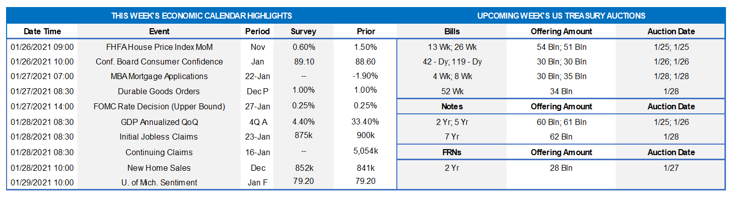 On the UST supply front, next week brings 2/5/7-year auctions. Corporate issuance should accelerate further post its usual strong start-of-the-year pattern. As predicted last issue, a slate of bank issuance occurred this past week post-Q4 2020 earnings releases. Focus this week will turn to the FOMC meeting yet also remain on Covid-19 and fiscal legislation developments.