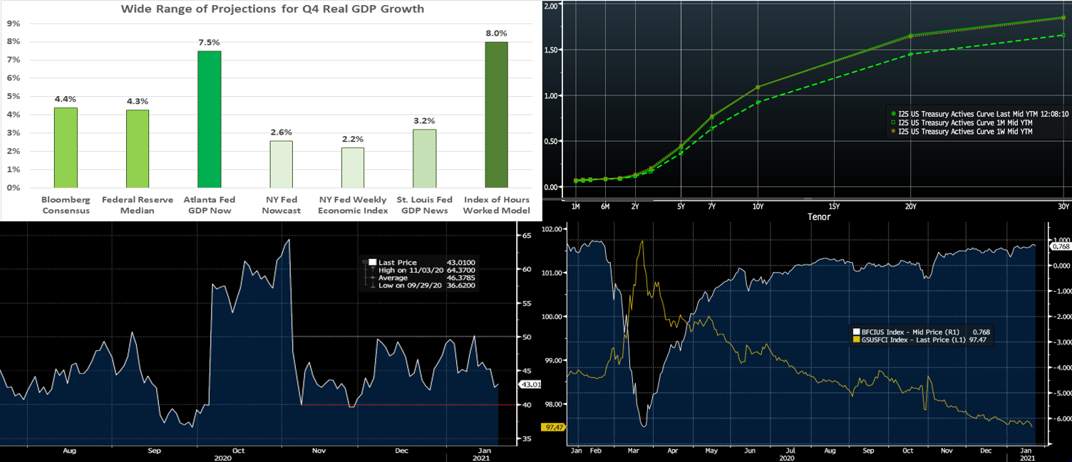 The first FOMC meeting of 2021 will be the key event this week. The FOMC is universally expected to reiterate that it expects to maintain an accommodative stance of monetary policy, with a federal funds rate target range of 0 to .25%, until it achieves maximum employment and inflation at a rate of 2% over the longer run. Moreover, the communiqué issued after the upcoming gathering likely will repeat that the Federal Reserve will continue to increase its holdings of Treasury securities by at least $80bn per month and of agency mortgage-backed securities by at least $40bn per month until substantial further progress has been made toward the FOMC’s goals. On the economic data front, the advance report on real GDP growth in Q4 likely will be the key release. Soundings from the housing sector are expected to remain strong. Consumer confidence, however, probably began the New Year on a low note.