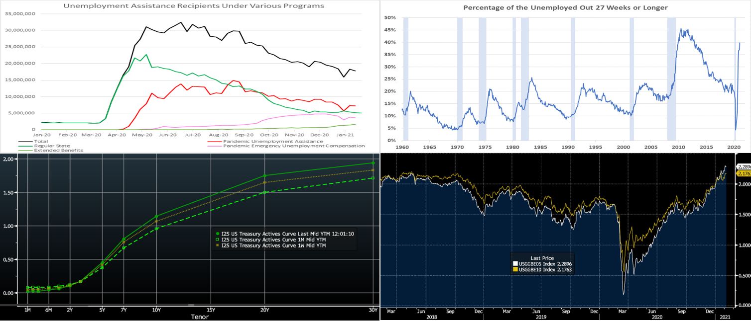 Source: Bloomberg. The UST curve notably steepened on the week, with shorter maturities 1-2 bps lower but maturities 5-year and out higher in progressive fashion by 1 to 8 bps. Having last week briefly touched 1%, the 10-year UST closed this week ~1.15%. The 2-year/10-year slope is at its highest since April 2017. The Fed’s guidance and programs continue to pin shorter-end yields, but longer-maturity yields are moving on various dynamics. The distressing Covid-19 situation of the past few months appears to be moderating to some degree, and bolstered vaccination programs are underway. A further round of relief legislation gathered steam this week, and Friday’s lackluster-to-mixed jobs data may serve to push closer the timing and increase the size of an eventual package along with the attendant UST supply to finance it. These dynamics pushed stocks higher and helped to support the “reflation theme” in the markets, namely that conditions could be primed for major improvement later in the year and thereafter. Also adding to the steepening move was the Treasury’s announcement of a record auction of 3/10/30-year UST’s this coming week.