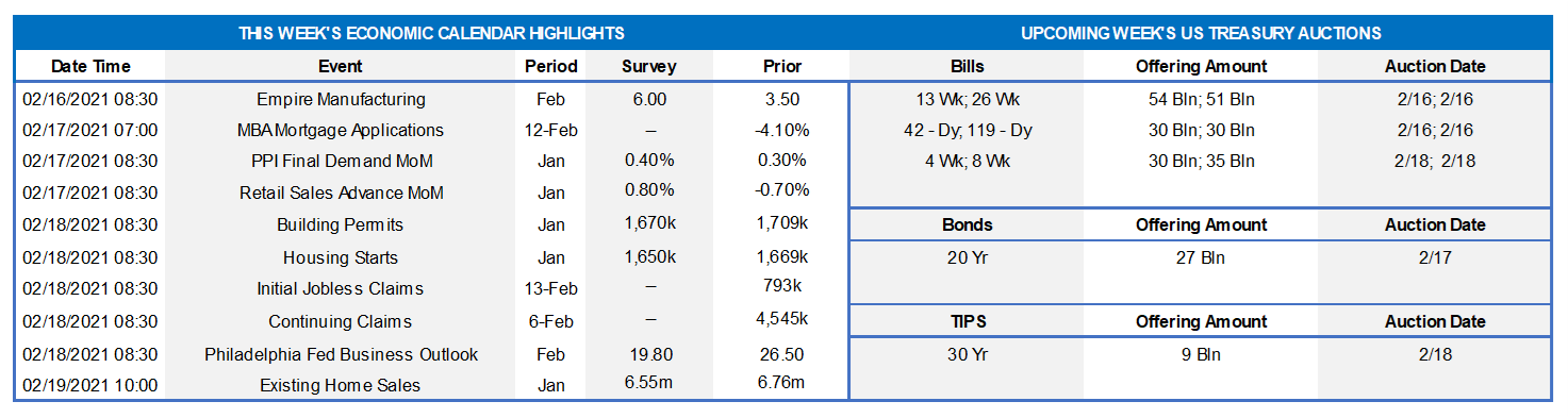 The attention of market participants will undoubtedly be focused on efforts to get the American Rescue Plan – the Biden administration’s $1.9trn fiscal stimulus package – through Congress in the upcoming holiday-shortened week. The economic release calendar will be crowded, due to the Presidents’ Day holiday. Retail sales are expected to have snapped back in January, reversing a portion of the fall-quarter decline. Soundings from the housing sector in January and February likely will remain solid, supporting the view that homebuilding will provide another boost to current-quarter real GDP growth. A trio of Federal Reserve officials will make public appearances on a variety of topics.