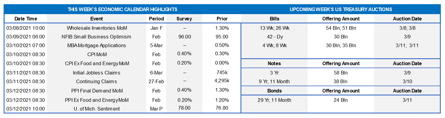 On the UST supply front, this week brings 3/10/30-year UST auctions. Recent auction sizes have been of record size and another contributor to the curve’s moves, as buyers have demanded higher yields. Focus this week will remain on Covid-19 and fiscal legislation developments.