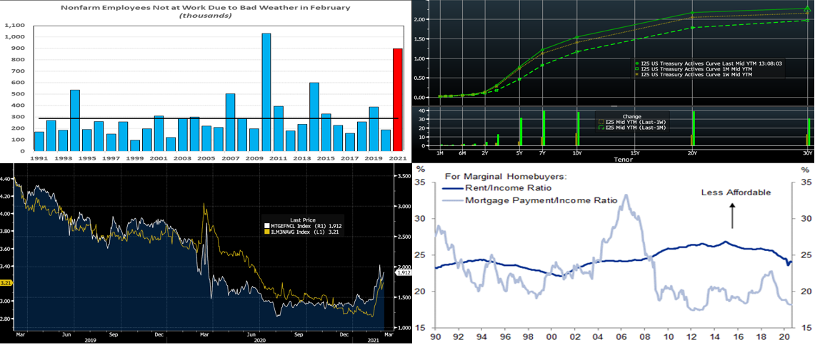 Source: BLS, FHLBNY. As impressive as February’s employment situation report was, last month’s figures likely understated the true health of the labor market. Indeed, a “black-box warning” accompanying the release highlighted that severe winter storms occurred during the Bureau of Labor Statistics’ canvassing period. A whopping 897K persons were unable to work, due to inclement weather conditions – well above the 289K historical average for February. Moreover, an additional 1.9mn employees who normally work full-time could only work part-time. Looking ahead, a return to more normal weather conditions could provide a significant lift to net job creation in March.