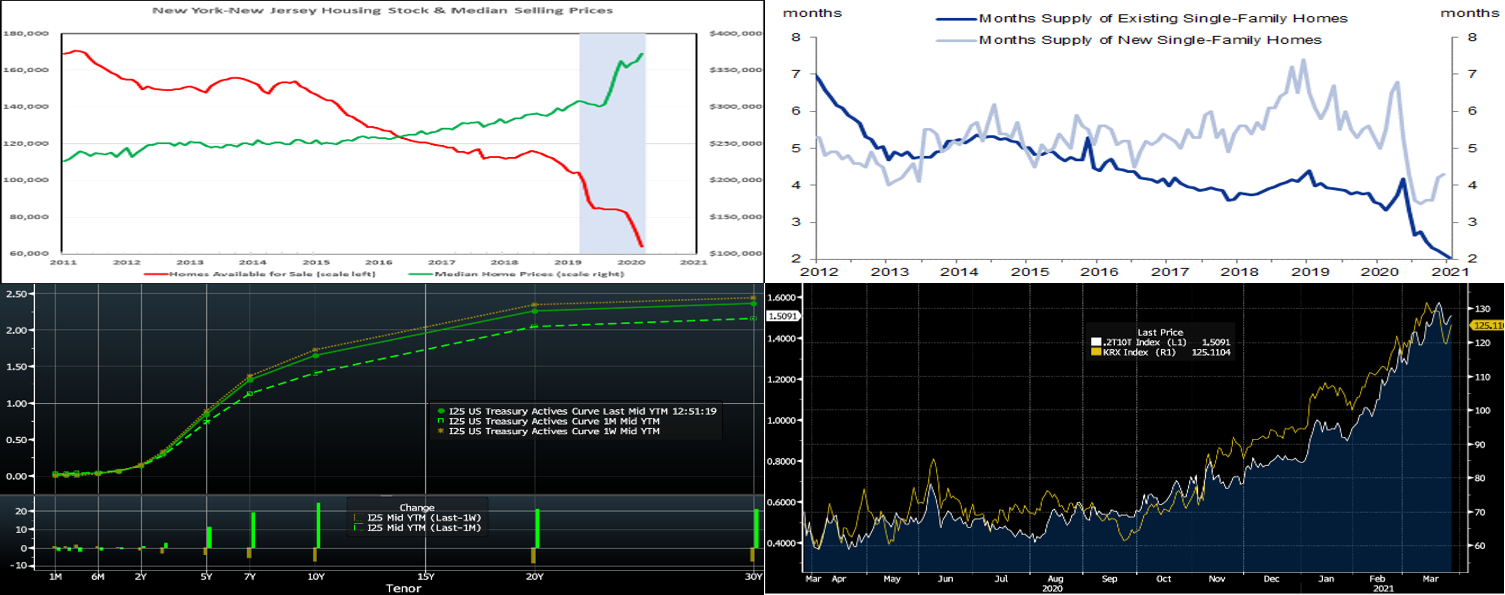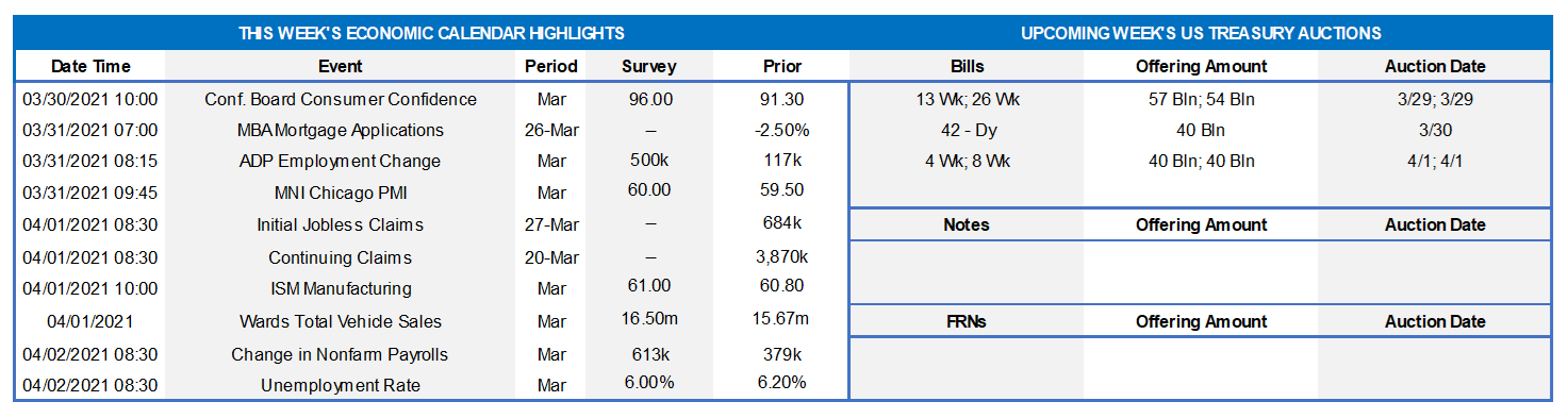 Source: Bloomberg. Note: top pane is yield (%), bottom pane is change (bps). The UST curve this week retraced some of its recent “bear steepening”. While shorter maturities finished a bp or two lower, the 5 through 10-year sector was ~2 to 7 bps lower, in progressive fashion. Essentially, yields reached levels that proved attractive for some investor bases, such as foreign investors, to add duration. Moreover, Fed officials “made the rounds” (interviews/speeches/Congressional testimony) with their consistent theme of “on hold” while emphasizing that the Fed will not act pre-emptively to “get ahead of” or stem near-term inflation signs. Meanwhile, the Covid-19 situation sits at elevated plateaus, but the notable upward trend in vaccinations has boosted economic optimism and projections. Relief/stimulus checks are reaching the public and talk of an infrastructure bill continues, thereby further provoking near-term upward adjustments to forecasts of both economic data and UST supply. Given these dynamics, an aggressive further retracement of the recent “bear steepening” would appear difficult.