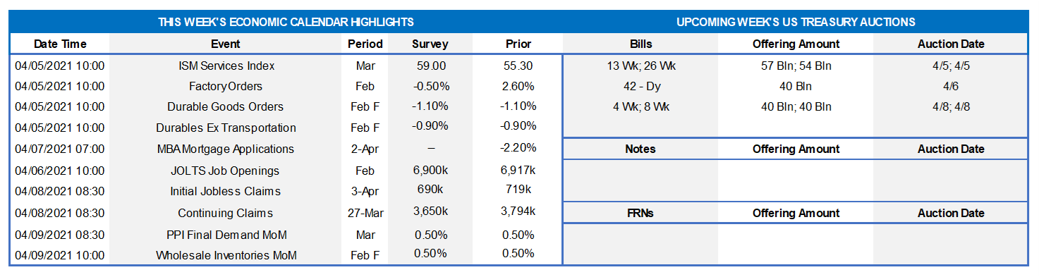 On the UST supply front, this week allows the market another reprieve. Recent auction sizes have been of record size and another contributor to the curve’s moves in Q-1. Much of Europe enjoys a long holiday weekend, and so activity and corporate supply may be light to begin the week. The market will keep focus on further Covid-19 and infrastructure bill developments; the Minutes from the last FOMC meeting will also be dissected for any signs of market-moving potential.