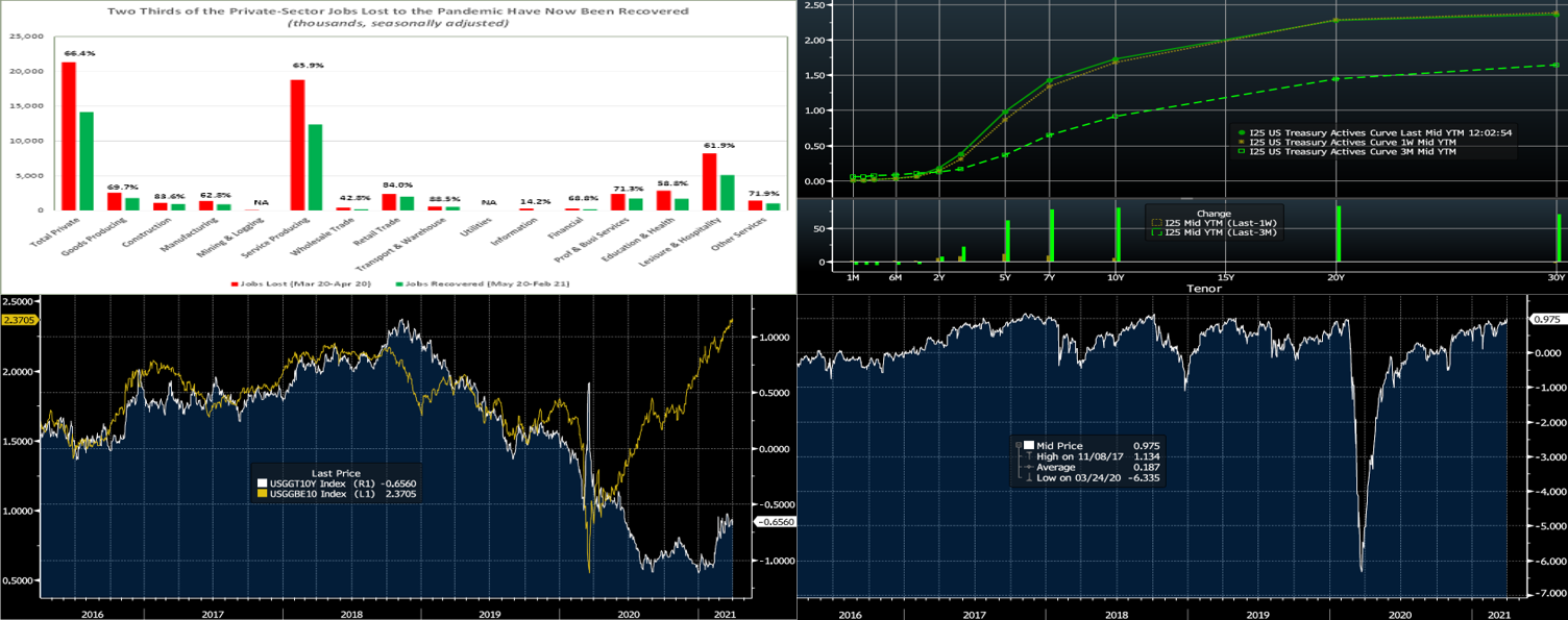 Source: Bloomberg. Note: top pane is yield (%), bottom pane is change (bps). Led by the belly (4 to 10-year sector) of the curve, UST yields pressed higher week-over-week. While shorter maturities finished 4-5 bps higher, the 3 through 7-year sector was ~10-13 higher, the 10-year ~5 higher, and the 20 to 30-year roughly unchanged. Economic data released over the week, most notably on the employment front, was positive and better than expectations. The Covid-19 situation still threatens at elevated levels, but the accelerating upward trend in vaccinations continues to spur higher activity, as evidenced by rising consumer mobility (dining/travel/”out and about”) data, thereby bolstering economic optimism and projections. Of consequence as well the past week was the Biden Administration’s unveiling of its infrastructure plan; while its spending would be gradual over time (years) and uncertainty prevails over what form and size of the plan can indeed pass Congress, it nonetheless can lead to upward adjustments to forecasts of both economic data and UST supply. These dynamics continue to underpin the yield curve. For perspective on the first quarter of 2021, note the significant “bear steepening” of the curve that occurred.