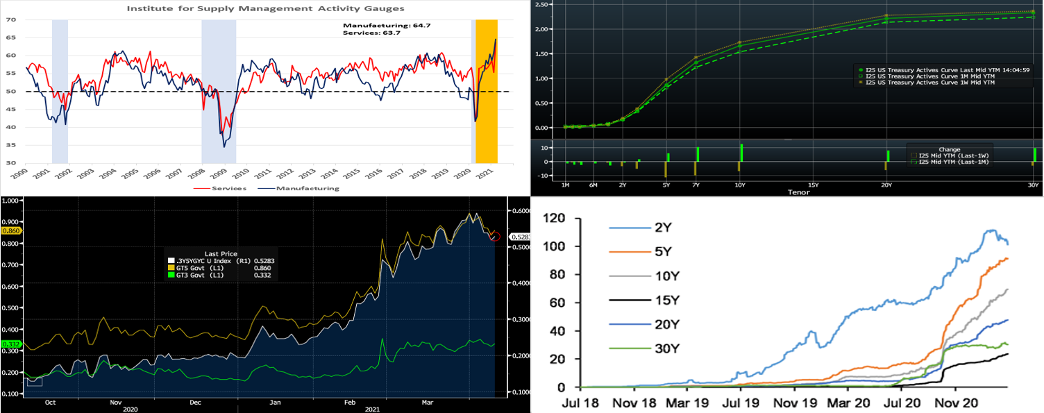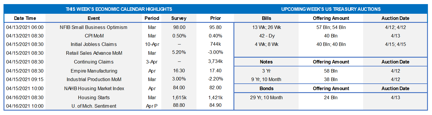 On the UST supply front, this week ends a reprieve and brings 3/5/10-year auctions. Recent auction sizes have been of record size and a contributor to the curve’s moves in Q-1. The market will keep focus this week on further Covid-19 and infrastructure bill developments, while also monitoring a heavy economic data calendar, for any signs of market-moving potential.