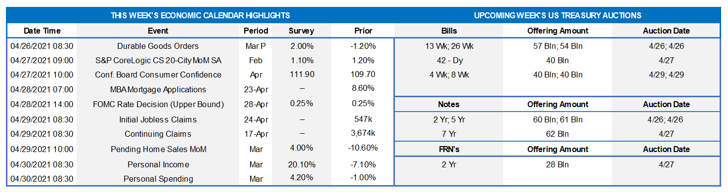 Source: Bloomberg. Note: top pane is yield (%), bottom pane is change (bps). UST yields again dipped lower week-over-week, in a mild “bull flattener” move. While shorter maturities were barely changed, the curve 4-year and beyond finished a few bps lower. Most of the decrease occurred on Thursday, in a slight flight-to-quality shift, when stocks fell on news of the Biden Administration’s capital gains tax proposal. But the markets reversed this shift on Friday, as the proposal was not truly “new news” and could likely be subject to negotiation and changes. Meanwhile, despite strong economic data during the week, yields remained in a contained range owing to continued foreign and real-money investor buying. Covid-19 variants and some vaccine obstacles (mainly hesitancy at this point) persist, but the thus-far uptick in vaccinations continues to foster economic activity and bolster growth projections which, in turn, are likely to underpin the yield curve. The market will “watch the Fed” this week, but any talk of tapering its asset-purchase program and/or changes to official rates are not expected from the meeting.