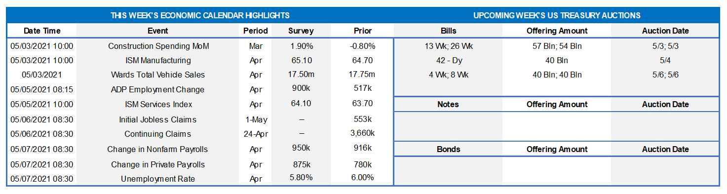 On the UST supply front, this week brings a reprieve in auctions. The market will maintain its attention on further Covid-19 and legislative developments this week, while also paying a close mind to the week’s employment data releases.
