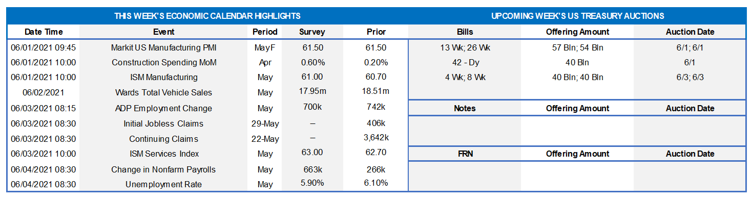 On the UST supply front, this week brings a reprieve in auctions. The market will maintain its attention on any Covid-19 and legislative developments this week, while also paying a close mind to fresh economic news and/or “Fed-speak”.