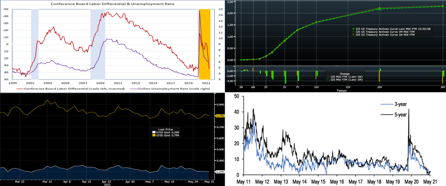 CHART 1 – UPPER LEFTSource: BLS, Conference Board; FRB St. Louis; FHLBNY. Notes: Blue-shaded areas denote recessions; orange denotes period beyond April 2020 when probability that the economy was in recession dipped below 1%. Consumers’ appraisals of current labor market conditions improved markedly in May. Indeed, the so-called labor differential – the percentage of survey respondents believing that “jobs are plentiful” less those who feel that positions are “ hard to get” – widened by thirteen percentage points to 34.6% this month – the healthiest reading since January 2020 before the pandemic struck. The May sounding suggests that the civilian unemployment rate could dip lower and through the 6% mark in the upcoming employment situation report.
