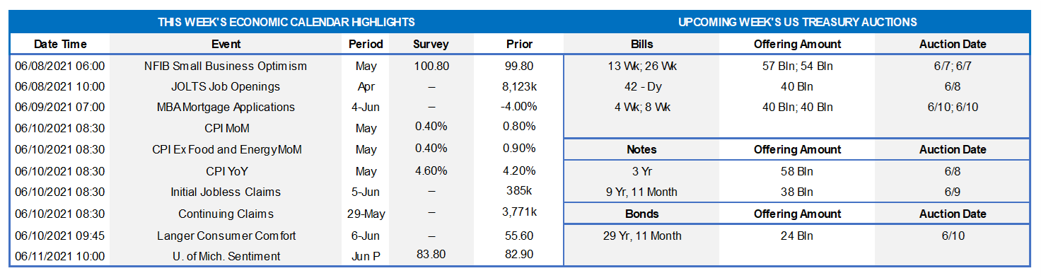 Market participants will enjoy a well-deserved rest this week. Except for the Bureau of Labor Statistics’ update on consumer prices in May, the light statistical calendar contains primarily second-tier releases. Small business confidence and consumer sentiment gauges probably improved in their latest respective reporting periods. Job openings likely dipped slightly in April from the record level posted in March. Jobless claims are expected to remain on downtrends but elevated compared to pre-pandemic levels. Federal Reserve officials will observe their traditional blackout period ahead of the June 15-16 FOMC meeting.