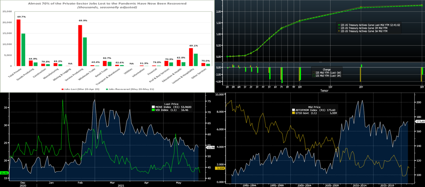 Source: Bloomberg. Note: top pane is yield (%), bottom pane is change (bps). In a holiday-truncated week, UST yields closed a few bps lower, led by the 5-year and longer sector. After trading relatively “sideways” for most of the week, yields moved lower on Friday post the employment report. Following Thursday’s strong ADP jobs release, Friday’s employment report was decent but below some heightened market expectations. Consequently, a few market-watchers termed it a “Goldilocks number”; in other words, while the report portrays progress, it was not enough to warrant more heightened concerns over inflation and/or Fed asset tapering. Consequently, short-covering ensued, even with UST supply looming this coming week. The Fed, as well as foreign and real money (such as banks and pension funds) investor buying, continues to provide a steady demand backdrop for bonds. In the past month, a few Fed members have begun to express that “the time to talk about tapering” of its asset purchase program is drawing nearer. All in all, this mix of dynamics continues to keep yields relatively range-bound, as evidenced in the chart.