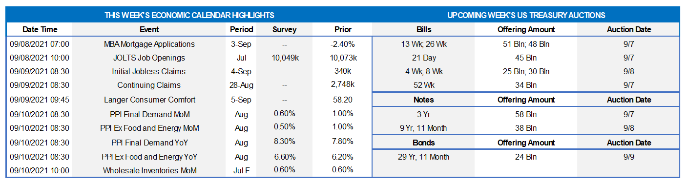 On the UST supply front, this week brings a $120 bln in auctions across the curve – 3s/10s/30s. The market will monitor economic data and any additional Fed officials’ pronouncements regarding the taper of bond purchases. September is the second most active month for Corporate issuance, so we could see significant flows in the treasury market throughout the month.