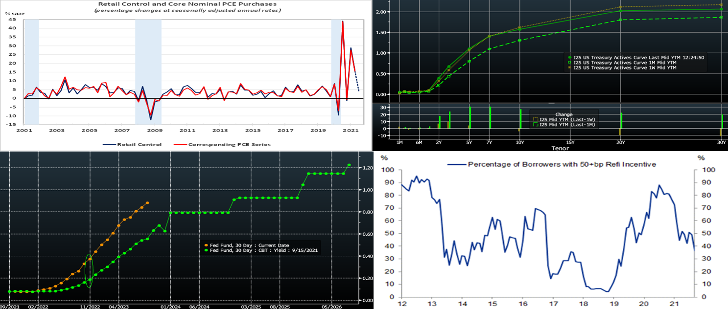 Source: Bloomberg. Note: Top pane is yield (%), bottom pane is change (bps). As of midday Friday of a holiday-shortened week, the UST curve was notably flatter week-over-week, as yields 5-year-and-in rose, but those in the longer end declined. For instance, the 2-year was ~6 bps higher and 5-year was ~4 bps higher, whereas the 10-year moved ~5bps lower and 30-year ~12bps lower. The move in the longer end was impressive, given that there were UST auctions in both maturities during the week; both auctions witnessed strong demand. Economic data during the week was generally positive. But the mid-week CPI release was above consensus expectations. The curve flattening appears to be driven by the market ‘s belief that the Fed will counter and contain the longer-term inflation threat via a taper announcement in the next two months and thereby “kick off” a removal of accommodation and application of rate hikes later next year.