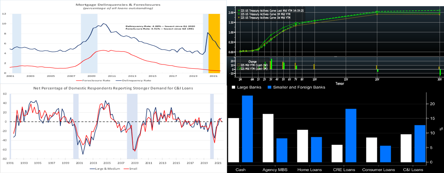 Source: Federal Reserve; FHLBNY. The recently released October 2021 Senior Loan Officer Survey on Bank Lending Practices provided insights on the Q3 environment. Regarding loans to businesses, respondents reported easier standards and stronger demand for commercial and industrial (C&I) loans to large and middle-market firms over Q3. Banks reported easier standards for C&I loans to small firms, while demand from small firms remained basically unchanged. Charted here is the demand side of the C&I sector. For commercial real estate (CRE), banks reported easier standards. Banks reported stronger demand for multifamily loans and nonfarm nonresidential properties, while demand for construction and land development remained basically unchanged. For loans to households, banks eased standards across most categories of residential real estate (RRE) loans, on net, and reported weaker demand for most types of RRE loans over Q3. Banks also eased standards across consumer loan categories, while reports on demand for consumer loans were mixed. A full report can be found at https://www.federalreserve.gov/data/sloos/sloos-202110.htm.