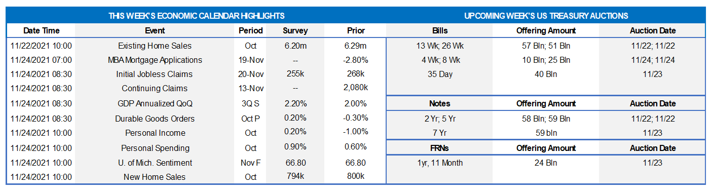 - On the UST supply front, this holiday-shortened week will bring 2/5/7-year auctions. The market will closely monitor this week’s legislative developments, namely the Senate follow-up on the Build Back Better Act, and economic data. For any borrowers wishing to settle on the post-holiday Friday but potentially away or shorthanded, note that a forward start advance can be executed prior to close of business on Wednesday. We wish our readers a Happy Thanksgiving!