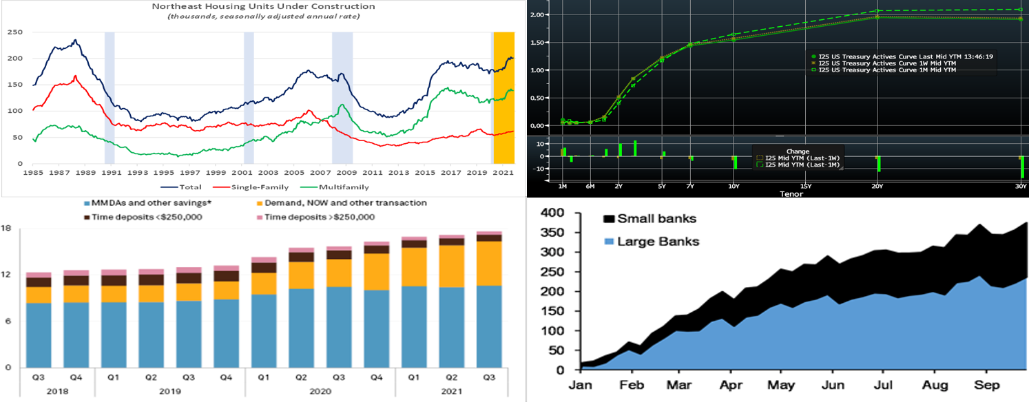 Source: Census Bureau; NBEA; FHLBNY. Blue-shaded areas denote recessions; orange-shaded area highlights current economic expansion. Amid widespread reports of a housing shortage in our region, last week’s update on residential construction activity in October suggests that some relief may be in the offing. The total number of housing units under construction in the Northeast edged slightly higher to a seasonally adjusted annual rate of 201K during the reference period. Over the past three months, the number of dwellings being built has approached levels last witnessed at the beginning of 1989. In contrast to the even split across the Nation as a whole, multifamily structures account for over two-thirds of the units under construction in our area. Data collected by the Census Bureau revealed that it took 6.8 months to build a single-family home in 2020, while multifamily structures took an estimated 15.4 months to complete. Given shortages of available workers, building materials, and supplies such as appliances, the time between breaking ground and a finished structure is undoubtedly longer this year.