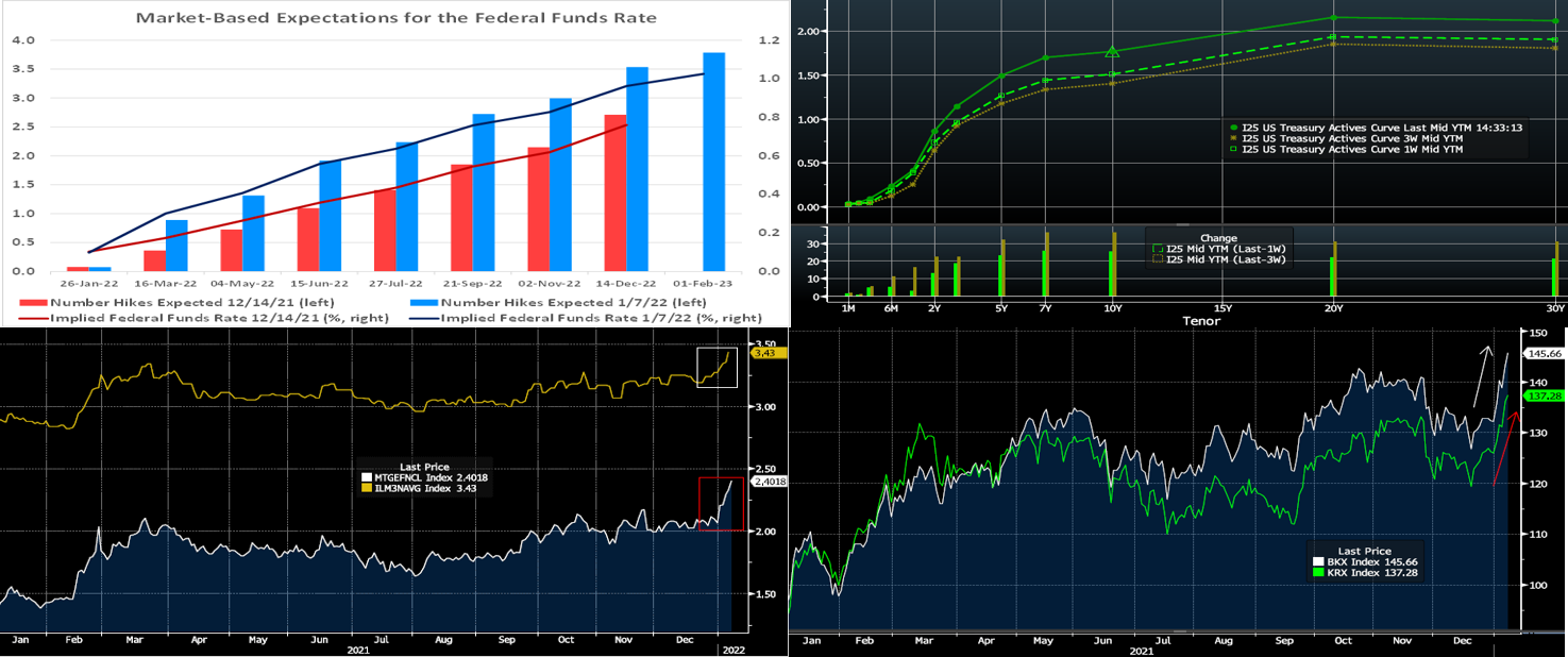 Source: Bloomberg. Note: Top pane is yield (%), bottom pane is change (bps). Relative to both our last edition three weeks ago and to year-end levels, UST yields are significantly higher. The 2 and 3-year points are ~22 bps higher from three weeks ago, while yields beyond that are up to an even greater degree. Various drivers have contributed to the move. The pandemic persists, but the Omicron variant has thus far proved less lethal than prior variants, thereby leading the market to perceive it as less of an economic threat. Meanwhile, various Fed members have vocalized support for both earlier rate hikes and even balance sheet runoff (not reinvesting principal payments). This past week’s release of the FOMC December Minutes reinforced a brewing hawkish mindset, as notable tidbits were that members now anticipate rate hikes earlier than previously expected and that hikes could be appropriate before maximum employment goals were met. Additionally, some members expressed support for balance sheet runoff beginning as soon as this spring. Topping off the instigators of higher yields was the past week’s surge in corporate bond supply, and next week brings a set of 3/10/30-year UST auctions.