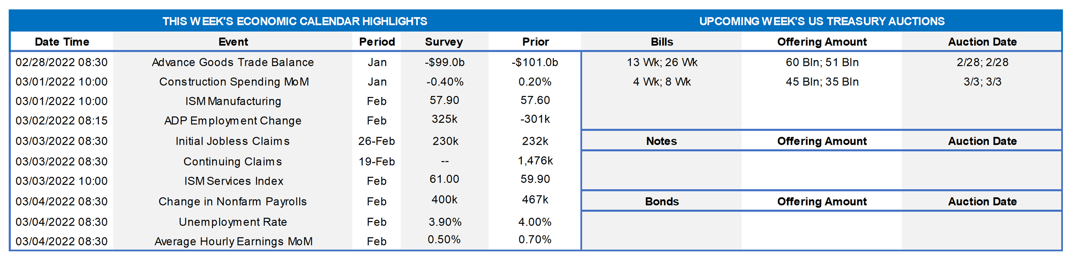 - On the UST supply front, this week serves a reprieve. Markets and rates are highly prone to move on Ukraine news and Fed-speak. Given market volatility, members should monitor conditions for potentially more optimal timing on transactions. Please call the desk for information on market dynamics, rate levels, or products.