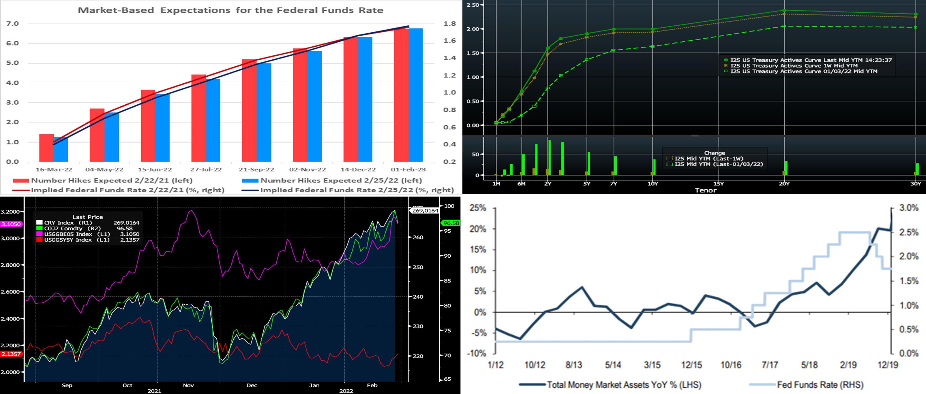 Source: Bloomberg. The Russia-Ukraine crisis has amplified an economic and market-related dynamic, namely that of rising energy and commodities prices in a global economy grappling with but also aiming to “leave behind” a pandemic. The upward price pressures, evidenced here in the CRB Commodities Index (White, RHS ) and Brent Crude Oil (Green, RHS,$), have spurred inflationary forces and expectations, as seen here in the rising 5-year TIPS Breakeven Inflation rate (Purple, LHS,%). As mentioned above, and despite the uncertainty and fluid situation, the market prices for the Fed to remain on course for at least a 25 bps hike at its March meeting. Note in the chart that the 5-year 5-year forward TIPS Breakeven (Red, LHS, %) is well below the 5-year and has generally traded in a sideways range in recent months. In this light, the market indeed expects the Fed to commence with hikes and for the inflation forces to be eventually arrested/resolved.