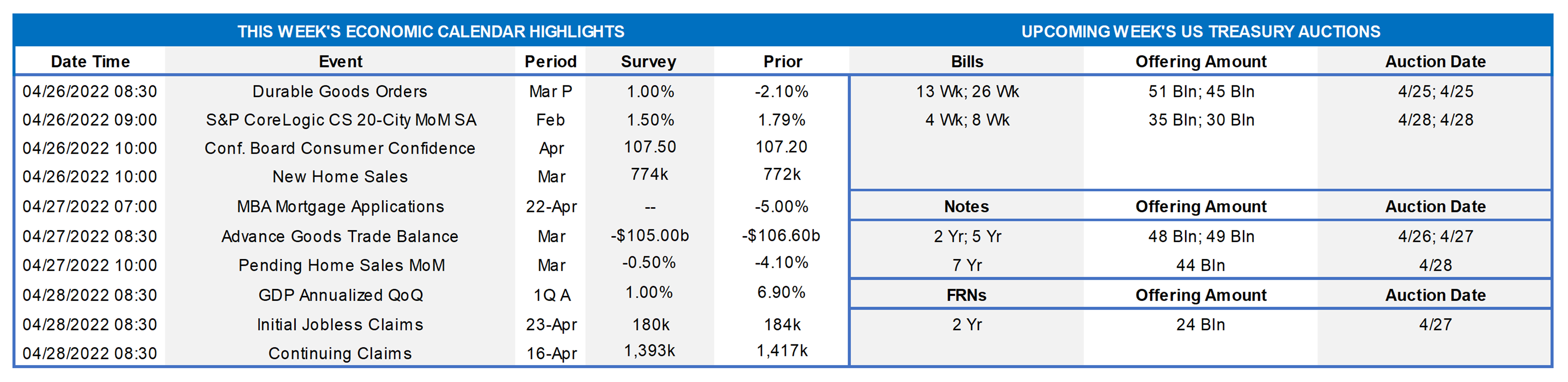 Source: Bloomberg. Note: Top pane is yield (%), bottom pane is change (bps). The UST yield curve aggressively bear flattened week-over-week. Yields in the 1 to 5-year sector finished ~17 to 32 bps higher, led by the shorter maturities, as the market priced for more aggressive Fed hikes later this year and 2023. Longer maturity yields rose to a lesser extent. Fed-speak again skewed “hawkish”. Fed Chair Powell declared that a 50 bps hike is “on the table” for the May 3-4 FOMC meeting. Fed Governor Daly, generally considered a “dove”, also cited the potential need for a 50 bps hike. Meanwhile, Fed Governor Bullard, considered a hawk, lobbed out the idea of a 75 bps hike. It appears that the Fed wishes to “get ahead”, or more like “catch up”, to market expectations and set the table for an imminent 50 bps hike. The market presently prices for just over a 100% chance of a 50 bps hike at both the May 4 and June 15th FOMC meeting; for the rest of 2022, it prices for ~250 bps (up from ~215 last week) of cumulative hikes from the current level. With the Fed in blackout mode before its May 3-4 meeting, market focus will be on economic data.