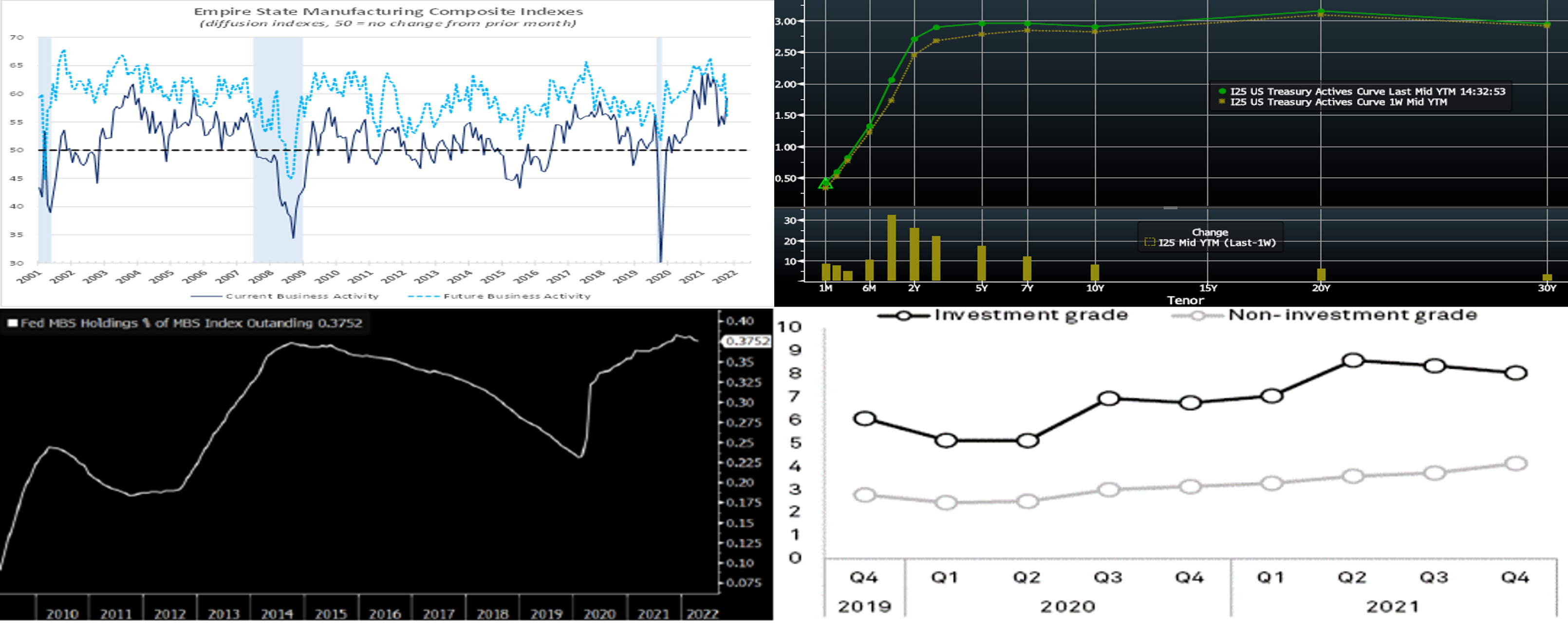 Source: Bloomberg. Depicted here is the share of the Bloomberg MBS Index held by the Fed. It surpassed its prior peak of earlier quantitative easing periods and reached a fresh high in 2022, now sitting at ~37%. In $ terms, the Fed’s portfolio holds ~$2.7trn of Agency MBS, while the Index represents ~$7.3trn of outstanding securities. The Fed is expected to announce its plans/pace for portfolio runoff at the May 3-4 FOMC meeting. As mentioned in our recent editions, the dramatic rise in rates has spurred concern that the Fed will eventually need to outright sell MBS too, as natural runoff may slow as a result of lower prepayments. These dynamics have contributed to the rise in market yields and the dramatic widening of MBS spreads in recent months. At this stage, current metrics on MBS may appear especially attractive for held-to-maturity or available-for-sale portfolios that can avoid mark-to-market noise. As of Friday afternoon, the 30-year mortgage Current Coupon (computed yield of a par-priced MBS) was at a 10-year high of ~4.16%. Its spread to USTs was at a 5-year high, disregarding the March 2020 COVID period. The FNMA 4% coupon was trading at a discount $ price of ~99-10.
