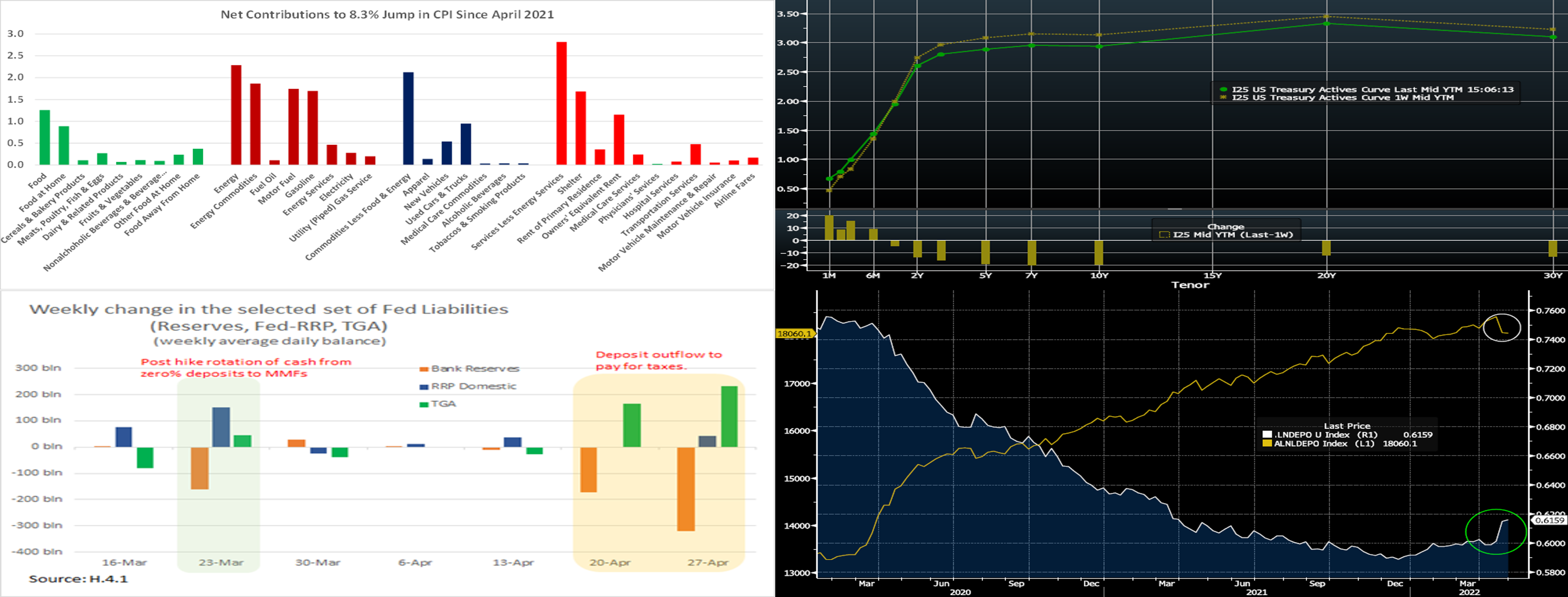 Source: FRB; FHLBNY. Portrayed here are recent flows in the cash and banking system. After the Fed lifted the policy rate off the 0% lower bound at the March FOMC meeting, cash rotated out of low or non-interest bank deposits into other vehicles. Deposits declined, as evidenced by the decline in bank reserves (orange bar). In turn, money market funds (“MMFs”) experienced inflows, as evidenced by the notable rise in the Fed’s RRP balance, a currently popular vehicle for MMF assets. This dynamic recurred following the May 4 FOMC policy rate hike. The short-end yield curve is now high enough for MMFs to be a more compelling vehicle net-of-fees, and so more of this cash rotation dynamic can be anticipated. Meanwhile, also seen here is the large increase in the TGA (Treasury General Account, green bar) in April. This dynamic largely resulted from a surge of higher-than-expected (~$491bn) personal tax payments. In turn, deposits experienced a decline, as reflected in the drop in bank reserves.