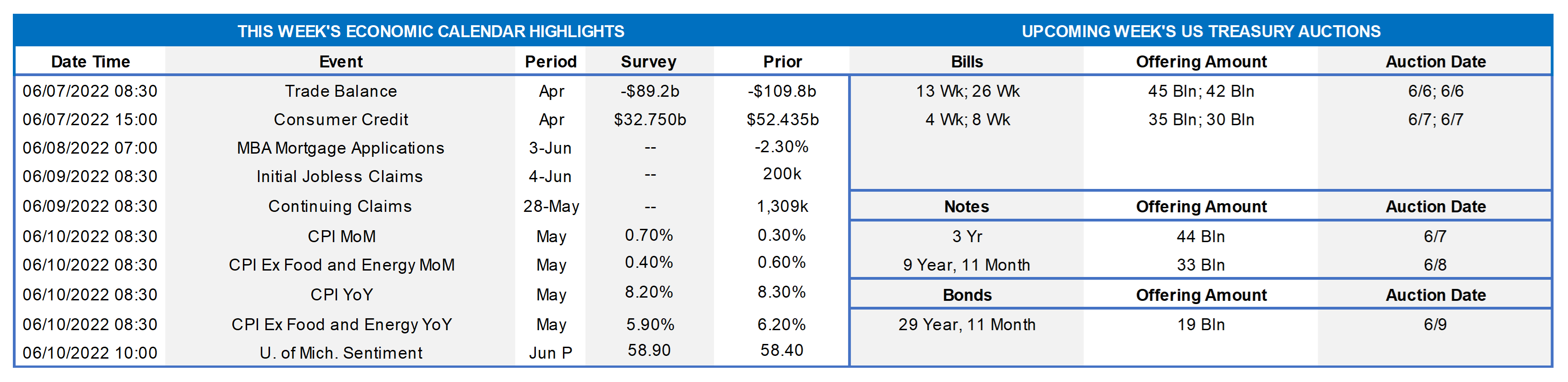 - On the UST term supply front, this upcoming week brings 3/10/30-year auctions. With a light economic data calendar and the Fed in blackout mode before the June 14/15th FOMC, markets may trade in a narrower range in eager anticipation of Friday’s CPI release. Please call the Member Service Desk for information on market dynamics, rate levels, or products.