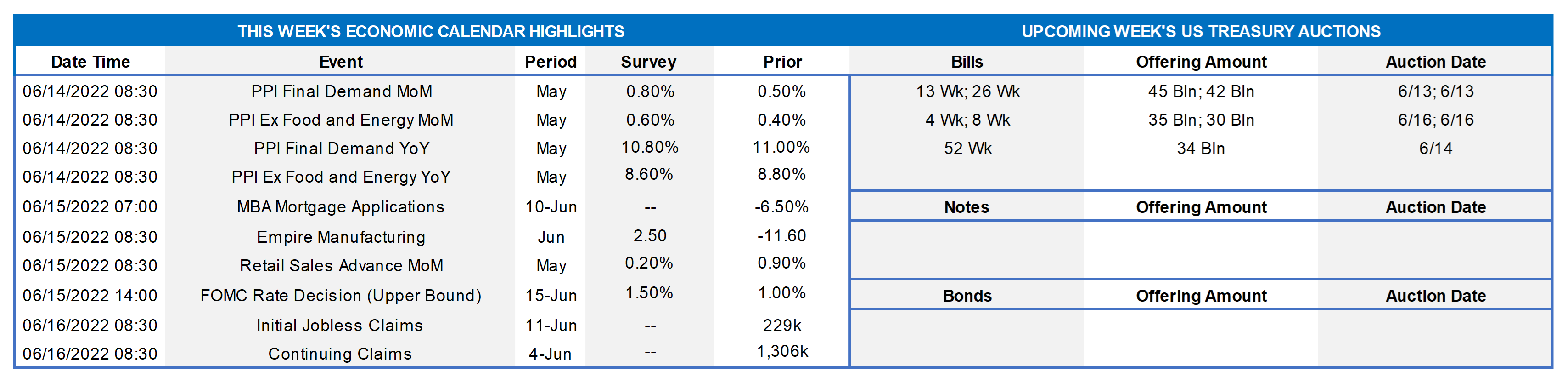 - On the UST term supply front, this upcoming week is devoid of auctions. Perhaps yields will steady or subside a bit from Friday afternoon levels, especially if Monday’s PPI data is softer than expected, but the clear focus of the week will be the June 15th FOMC result. Please call the desk for information on market dynamics, rate levels, or products.