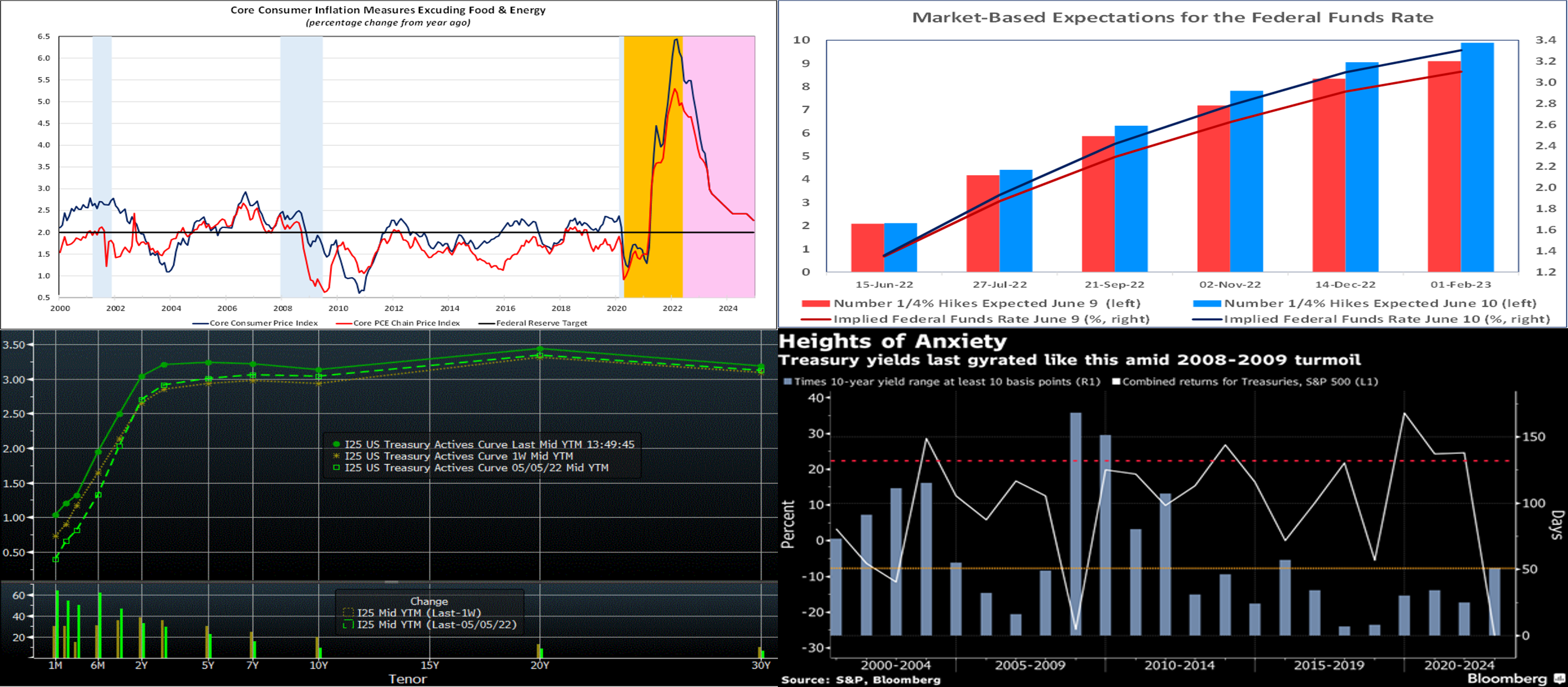 Source: Bloomberg. Note: Top pane is yield (%), bottom pane is change (bps). As of Friday afternoon, yields were notably higher across the curve from the week prior, in a “bear flattening” move led by shorter maturities. While the 10-year UST was ~20 bps higher, the 2-year UST was nearly 40 bps higher! And the 5-year/30-year slope inverted to ~ -5 bps. The curve has more than retraced the declines experienced in some previous weeks and is now clearly higher and flatter than post the May 4 FOMC meeting. The week’s move was predominantly driven by the higher-than-consensus CPI data on Friday which sparked a dramatic bond market selloff and re-pricing upwards of Fed hikes. Also contributing to higher yields was mid-week news that the ECB plans a rate hike next month, its first in a decade, thereby serving as a reminder of the global and still challenging nature of inflationary forces. The market’s focus will turn squarely to this upcoming week’s FOMC meeting.
