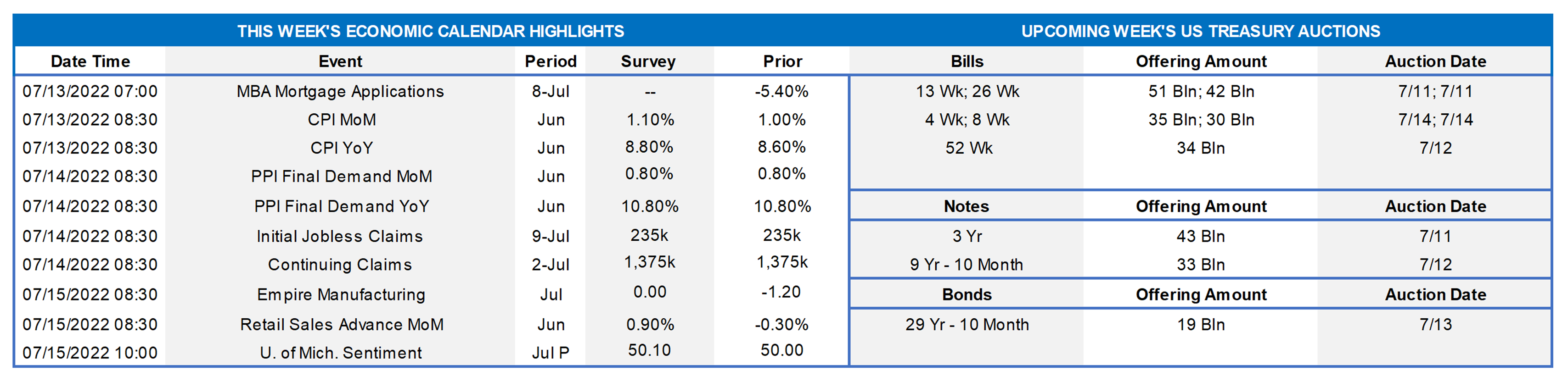 Market participants will experience a relatively quiet economic release calendar this upcoming week, following a holiday-shortened week that revealed modestly hawkish June-FOMC minutes and a strong June jobs data report on Friday. All due this upcoming week, June reports on consumer prices, producer prices, retail sales, and consumer sentiment will allow economists to continue to track where the economy is headed. As of this writing, the consensus anticipates CPI to be higher than last month’s reading, and PPI to be flat to the prior month. Retail Sales are expected to rebound vs. June’s negative figure. Rounding out the calendar is the closely watched University of Michigan consumer sentiment figure. Given the Fed’s focused fight vs. inflation, the inflation data is likely to be the week’s highlight and potential market-mover.