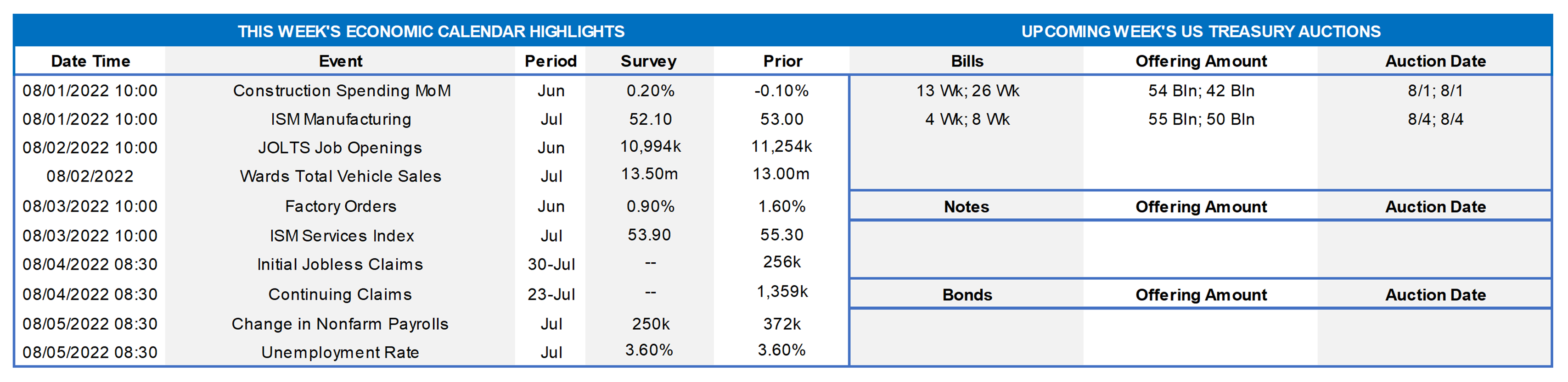 - On the UST term supply front, this upcoming week offers a reprieve from auctions. Market focus will return to data, particularly the jobs report. Please call the desk for information on market dynamics, rate levels, or products.