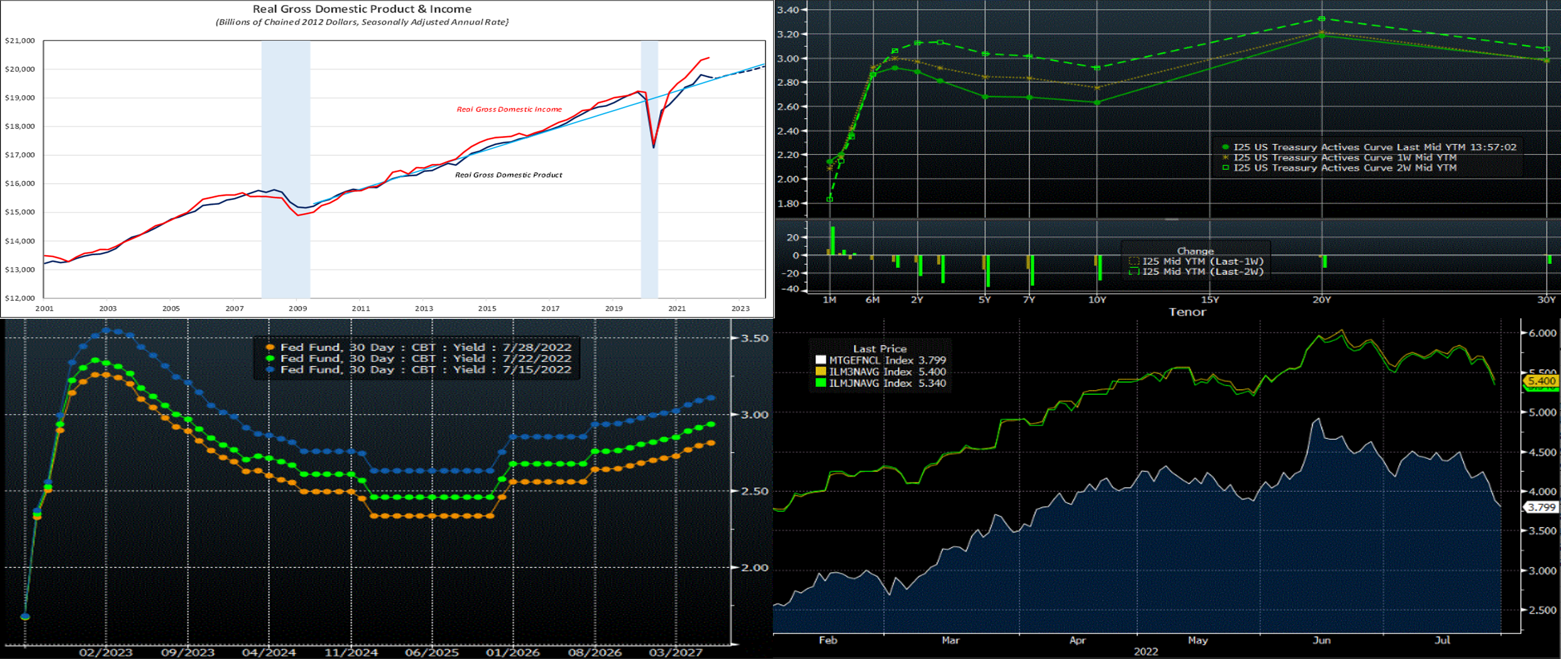 Source: Bloomberg. Note: Top pane is yield (%), bottom pane is change (bps). The UST yield curve finished lower from a week prior, led by the belly (5 to 7-year), as the market priced for a less aggressive Fed hiking cycle (see further color below in next chart) post the FOMC meeting as well as some weaker-than-forecast economic data releases which sparked further concern about potential recession. The 1-year-and-in maturities were 5 to 7 bps lower. While 2-year was ~8 bps lower, 5-year finished ~16 bps lower week-over-week. As seen in the chart, yields are notably lower than two weeks ago. Market volatility, while lower than in previous months, remains high, and so we encourage members to remain in touch with the desk for information and color.