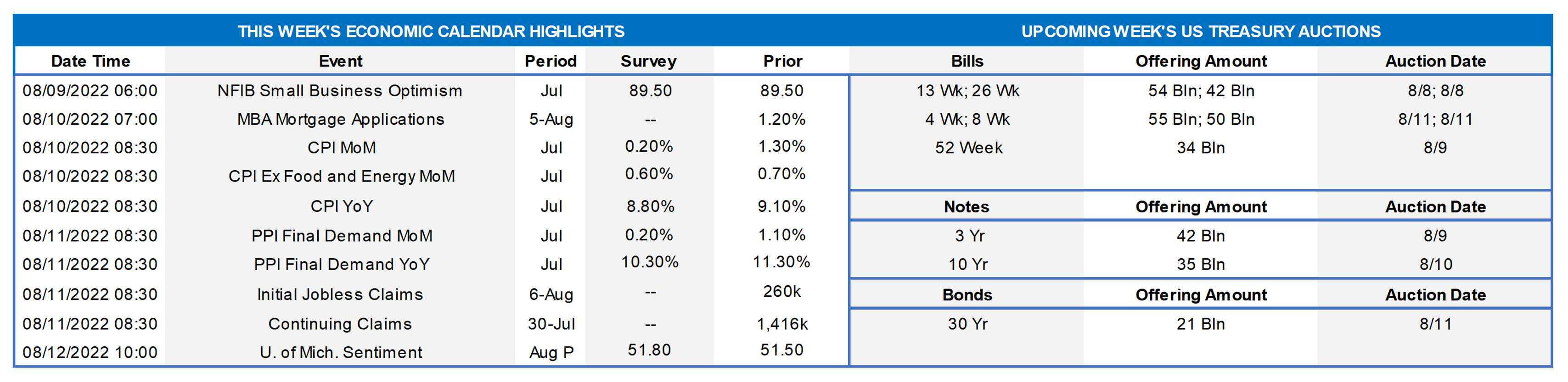 - On the UST term supply front, this upcoming week carries 3/10/30-year auctions. Market focus will remain on data, particularly Wednesday’s CPI report. Please call the desk for information on market dynamics, rate levels, or products.