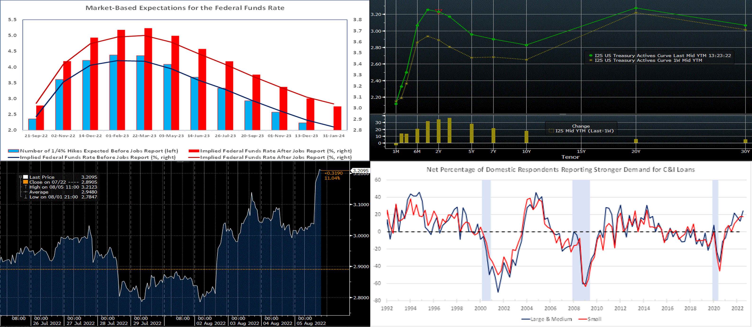 Source: Bloomberg; FHLB-NY. This past Friday’s scorching employment report for July triggered a sizable repricing of expectations for prospective Fed Funds increases. Entering the jobs data, market participants had been leaning toward a more moderate 50 bps increase at the next FOMC meeting on September 20-21. News that 528K jobs had been added and that the unemployment rate dipped to an expansion-low 3.5% boosted the probability of another 75 bps hike on September 21st from ~35% to 80%. Market expectations remain at odds with those expressed by Fed officials in the “dot plot” issued after the June meeting, however. In contrast to policymakers’ forecasts for continued hikes over the course of this year and next, the market anticipates that the tightening cycle will be complete by next March.