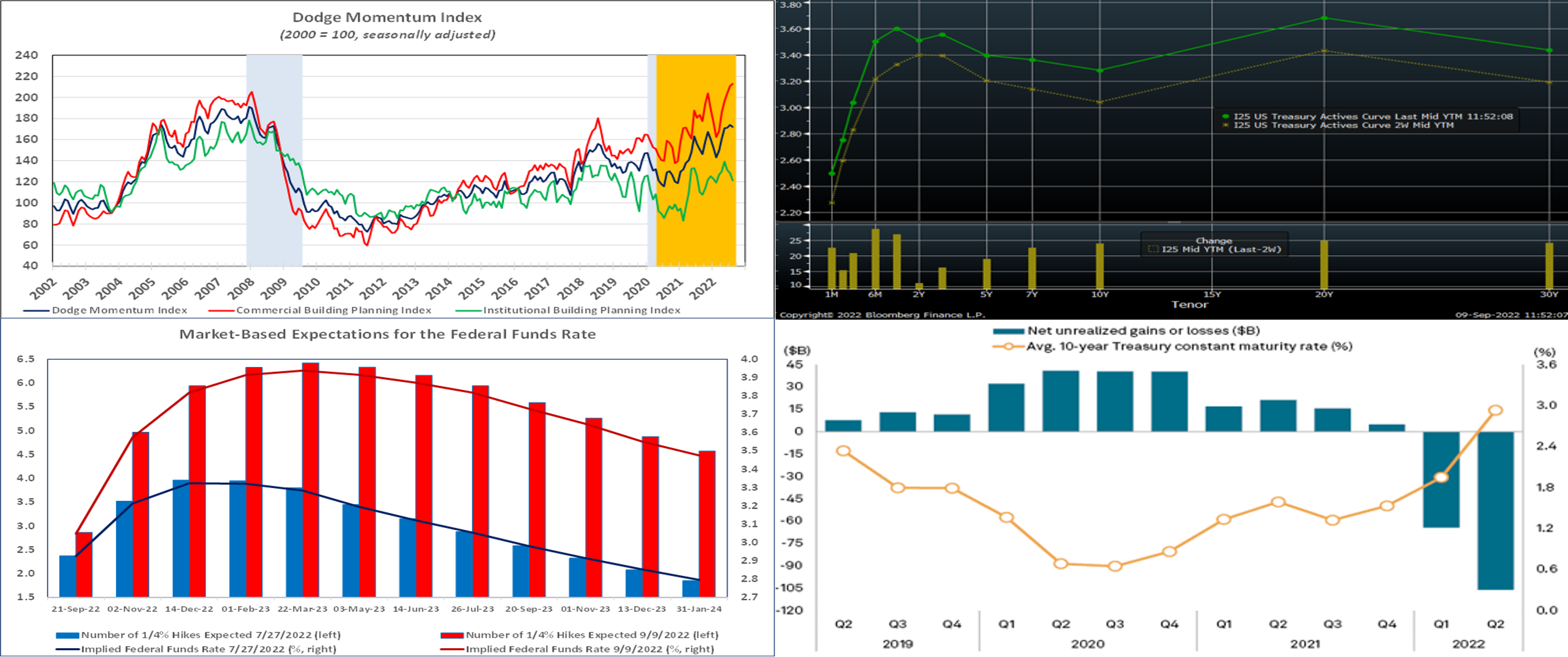 Source: Bloomberg; FHLB-NY. The dynamics cited above have led the market to price larger forthcoming hikes and to pare back pricing of a prospective Fed easing cycle in late-2023, clearly seen in this view of current market pricing vs. that from the July 27th FOMC meeting. Multiple market strategists this past week amended their call for the Sept. 21st FOMC from 50 to a 75 bps hike. As of this past Friday midday, the market priced for a 100% chance of a 50 bps hike at the Sept.21st FOMC, with ~88% chance of a 75 bps hike. For 2022 cumulatively from now, the market prices just shy of 150 bps of hikes.