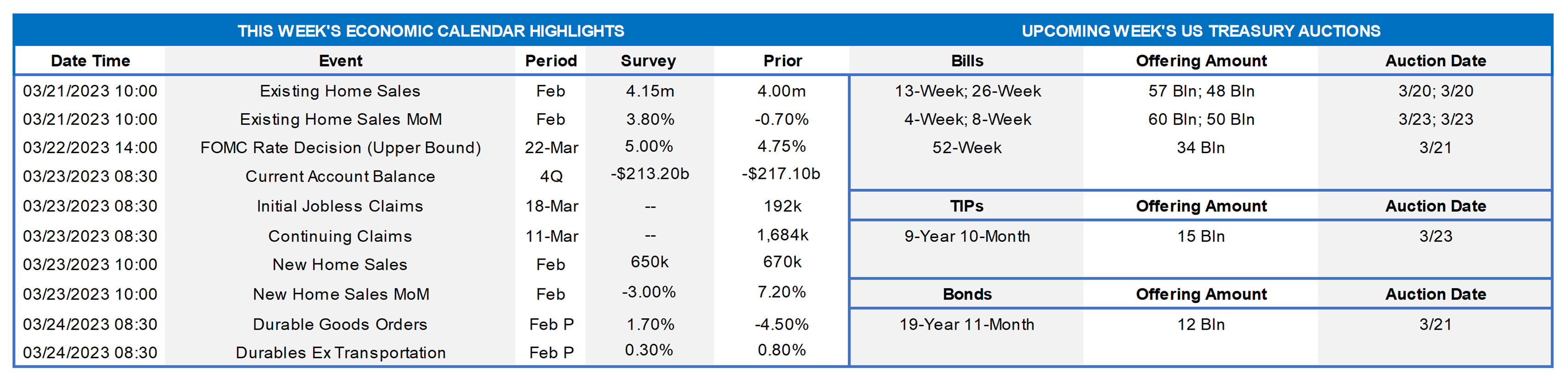 - On the UST term supply front, this upcoming week serves a 20-year nominal and a 10-year TIPS auction. Banking and Fed headlines will likely rule the week. Kindly call the Member Services Desk for information on market dynamics, rate levels, or products.