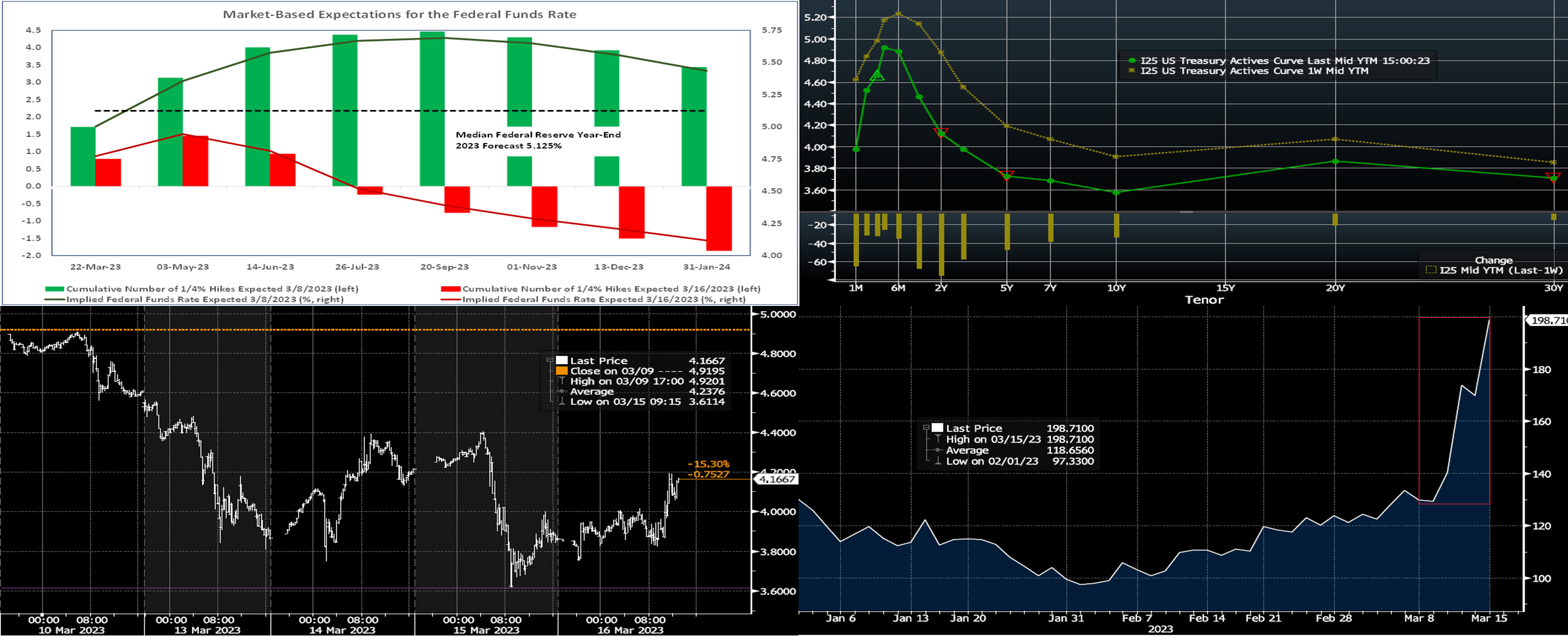 Source: Bloomberg. Top pane is yield (LHS, %), bottom pane is change (bps). From last Thursday afternoon to this, it has been a week to remember! As of this writing and still constantly moving, UST yields were notably lower than the week prior. The 2-year was the clear leader, down ~75 bps, while 5-year was ~45 and 10-year ~33 bps lower. The Fed was in blackout mode, and data took a backseat to the main market-mover of the week, namely the banking sector news and turmoil. Rates markets, to put it simply, were “all over the place” (see following charts/color). For the March 22nd FOMC, the market as of now prices ~77% probability of a 25 bps hike, much lower pricing than a week prior. The market’s pricing for end-2023 is now ~4.16%, down 128 bps from last week’s 5.44%! The market, moreover, has priced the peak rate at ~4.93% for this spring, to be followed by cuts in the subsequent months; this pricing is a massive change from a week prior. The volatility and lower rates spurred good demand from the membership in term space, and we encourage members to engage with us on levels and market intelligence.