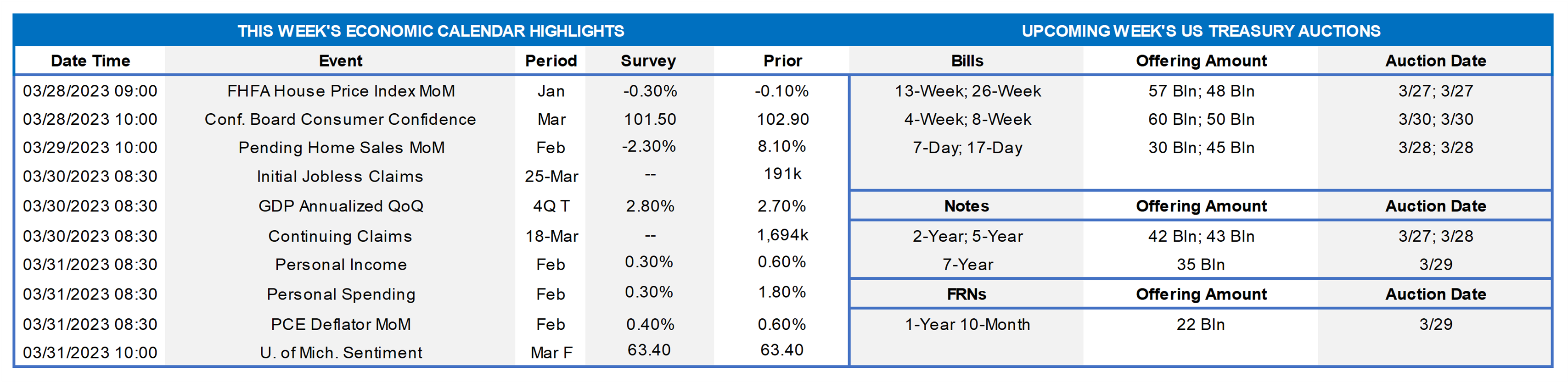 The Fed increased the fed funds target range by 25 bps to 4.75%-5% and forecast, via the fresh “dot plot” and official statement, that another 25bps hike could be appropriate by year-end. It did, however, hint that another hike is uncertain. Policymakers essentially attempted to thread the needle of stressing their keen focus on wrestling down price pressures while also now paying attention to banking system threats. With the FOMC outcome (see following slide for more specific color) in the rear-view mirror, attention will return to economic data while remaining focused on any fresh banking industry developments. The latter appeared to be simmering down from the frenetic news releases and activity of a week ago but perked up as of this writing on Thursday afternoon. This upcoming week’s reports on growth and prices will provide context on the effects of the Fed policy and potential future action.