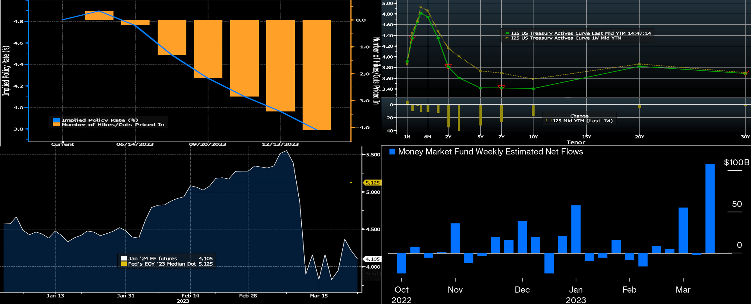 Source: Bloomberg. Here is the latest (Thursday mid-afternoon) look at market pricing (LHS is implied policy rate, RHS is number of hikes/cuts) of Fed rate policy. For the next FOMC on May 3rd, the market prices for ~33% chance of a 25 bps hike. And May is now priced as the peak rate of the tightening cycle, as the June FOMC currently prices a 53% probability of a cut! Subsequent cuts are also priced into the curve, clearly at odds with the latest Fed statement and dot plot.