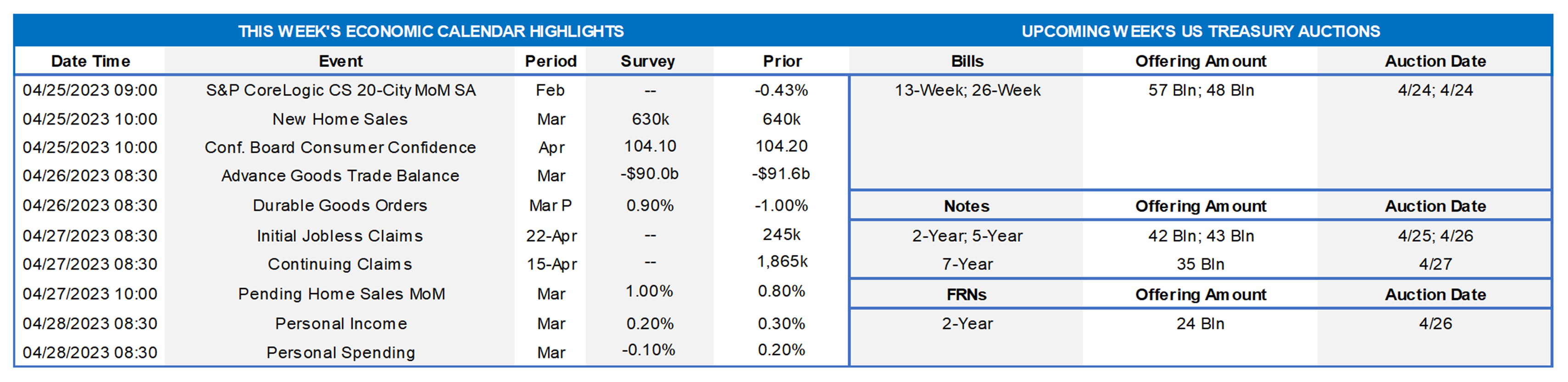 Personal Income & Spending: Personal income and consumer spending likely were little changed in March, following respective .3% and .2% upticks in February. The core PCE inflation gauge probably rose by .3% last month, clocking in 4.5% above its March 2022 level.
