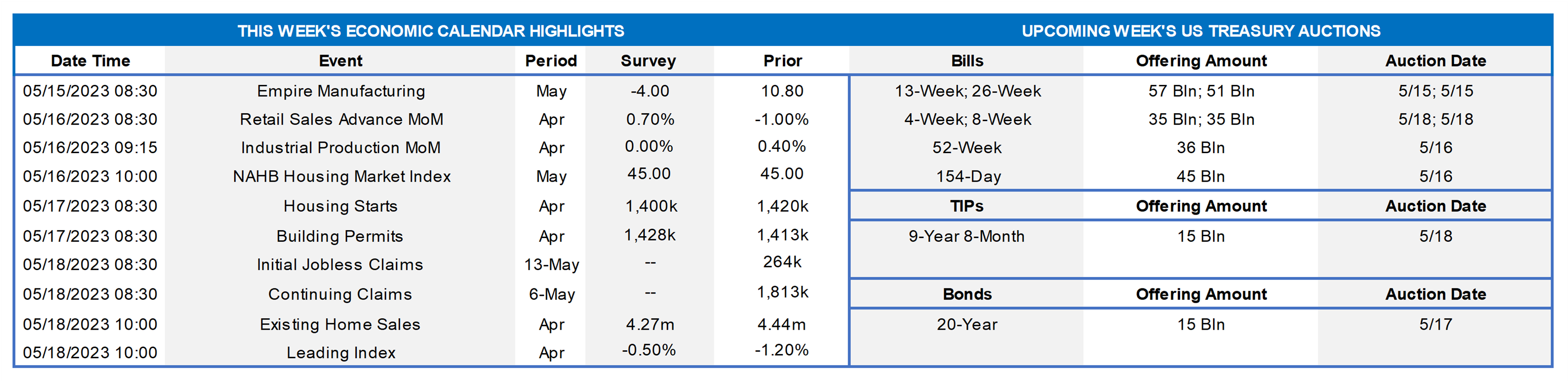 Market participants will weather a crowded economic calendar this upcoming week. Reports on retail sales, industrial production, and housing activity in April will allow economists to update their tracking estimates for spring-quarter real GDP growth. The Street currently anticipates little change in inflation-adjusted activity over the April-June span, but the range of projections is extremely wide, as is often the case early in a quarter. Public speaking engagements by a half dozen Federal Reserve officials will be closely watched for their thoughts on monetary policy prospects.