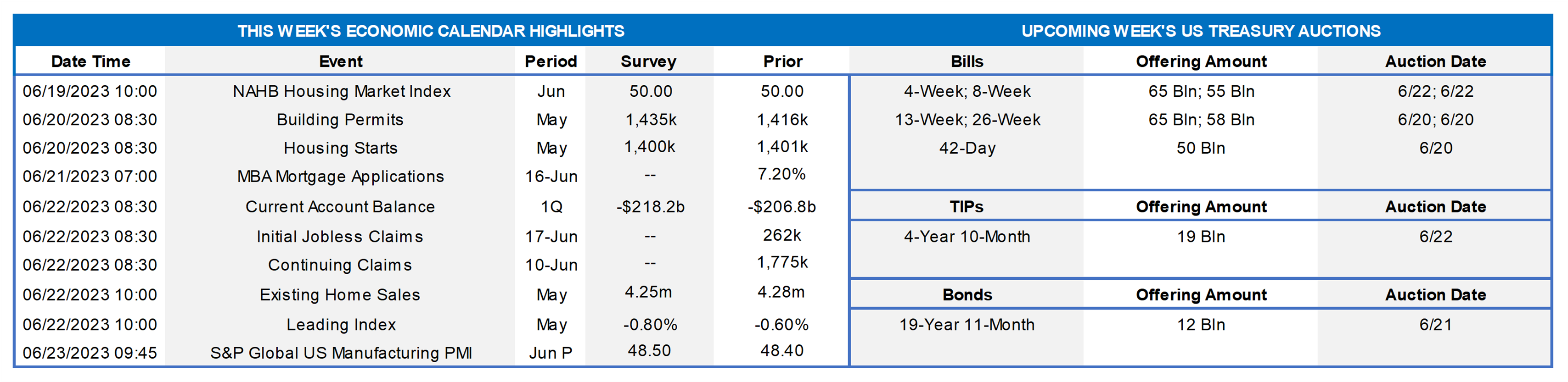 - Short-end rates are mostly lower by 3 to 5 bps from a week ago. In prior weeks, the debt ceiling issue pressured T-bill yields higher which, in turn, dragged ours and other short-end rates higher too. But the debt ceiling agreement brought relief and has allowed short-tenor yields to decline in the past two weeks. Additionally, FHLB supply has subsided from previous peak levels of spring. Net T-bill supply remains robust, as Treasury rebuilds its account post-debt ceiling agreement; thus far, it has been absorbed well, as Money Market Funds switch from the Fed’s RRP to the Treasury’s new short tenor offerings with slightly higher yields.