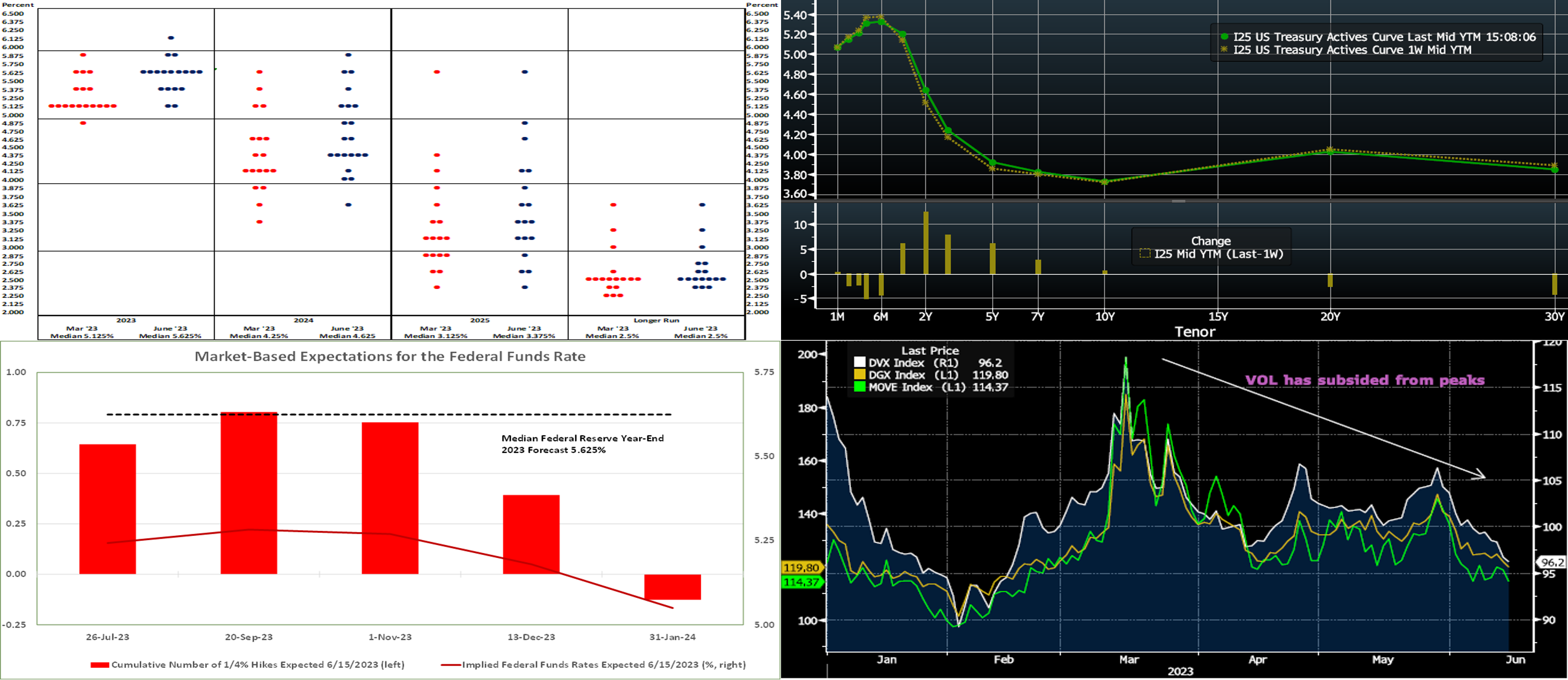 Source: Bloomberg; FHLB-NY. Shown here, and illuminating the above color, is the latest (Thursday afternoon) market-implied Fed Funds rate expectations (LHS is number of cumulative 25 bps moves shown in bars, RHS is rate shown via red line, both derived from Fed Funds futures and swaps curves). The market’s pricing of the Fed path has shifted notably upwards in the past month. Indeed, after the May FOMC, there had been a slight chance of an ease priced for this past Wednesday’s FOMC! Yet the market currently still “underprices” the Fed’s dot plot. While the Fed’s year-end 2023 median forecast is 5.625%, the market’s pricing is ~5.18%. Looking further, not shown here, the dot plot has 4.625% for year-end 2024, whereas the market prices at ~3.65%.