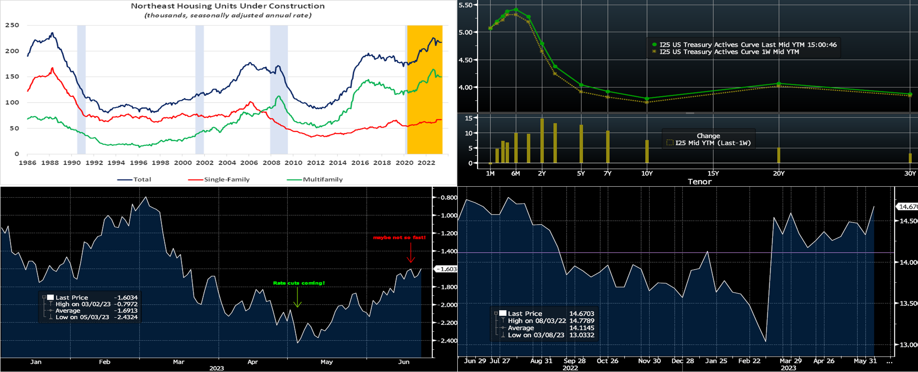 Source: Bloomberg; FHLB-NY. Shown here is the OIS (Overnight Index Swap, essentially representing the market’s Fed Funds rate projections) curve differential (RHS, %) of 3-month vs. 3-month 18-months forward. These curve points have been referenced in the past by Fed Chair Powell as ones he monitors for gauging recession expectations. In recent editions, we have noted that the market’s pricing of the Fed path has shifted notably upwards in the past six weeks. As can be seen here, in early May, the market was aggressively pricing, via these severely inverted curve points, a Fed easing cycle to commence this year and to continue through 2024. While the market still prices an easing cycle, the start and pace of it have been notably pared back in recent weeks. Consequently, the overall yield curve has moved higher and flatter over this period.