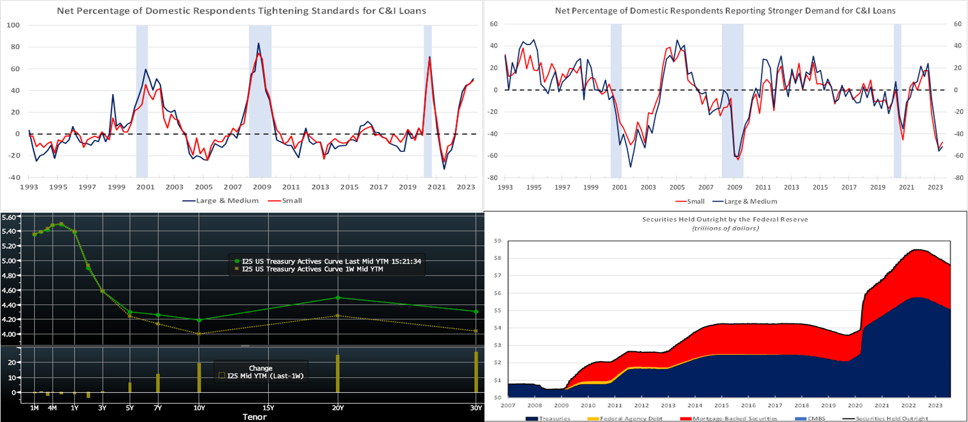 Source: Board of Governors of Federal Reserve System; FHLB-NY. While market participants continue to focus on the prospective path of the federal funds rate, it is useful to take a closer look at the other element of the current tightening of monetary policy, namely the contraction of the Fed’s System Open Market Account (SOMA), a process variously referred to as “Quantitative tightening” or “balance sheet normalization.” Essentially, in this way, the Fed is removing cash from the financial system after the expansion in the post-Great Financial Crisis decade. Since reaching a peak of ~$8.5trn in June 2022, roll-offs of maturing securities have pared the Fed’s securities portfolio by $894bn to just over $7.6trn. Yet, despite the significant reduction, the SOMA remains twice as large as the $3.8trn recorded before the COVID-19 crisis. Most of the decline has been in USTs, especially given the slow pace of prepays in MBS. In last week’s FOMC press conference, Chair Powell declared balance sheet runoff and rate moves as independent and that the former could continue even if the Fed pauses and/or subsequently cuts rates. The Fed maintained the current per-month runoff caps of $60bn for USTs and $35bn for Agency MBS. In this light, this dynamic can be expected to persist for some time.