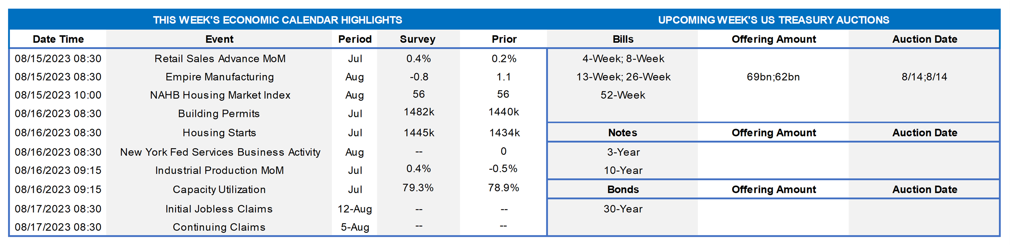 Source: Bloomberg. Top pane is yield (LHS, %), bottom pane is change (LHS, bps). From last Thursday afternoon to this one, the curve traded mildly lower led by the belly, with 3 to 10-year yields lower by ~8 bps. Given the large UST auctions of 3/10/30-year over the week, the dip in yields was somewhat surprising and perhaps driven by short-covering from “fast-money“ trading types and an as-expected benign CPI release. Moreover, the market pushed a bit lower its pricing of future Fed moves. In terms of market-implied pricing of the Fed, the 2023 peak Fed Funds rate in November now stands at ~5.41%, down from 5.43% last week. Essentially, the market is pricing a ~33% chance of one more 25 bp hike this year. The year-end forward is at ~5.38%, or ~2 bps lower than last week. The years 2024 and 2025 moved lower from a week ago, with the year-end 2024 forward ~11 bps lower, at 4.04%, from a week ago. Please call the Member Services Desk for further information on market dynamics and/or products.